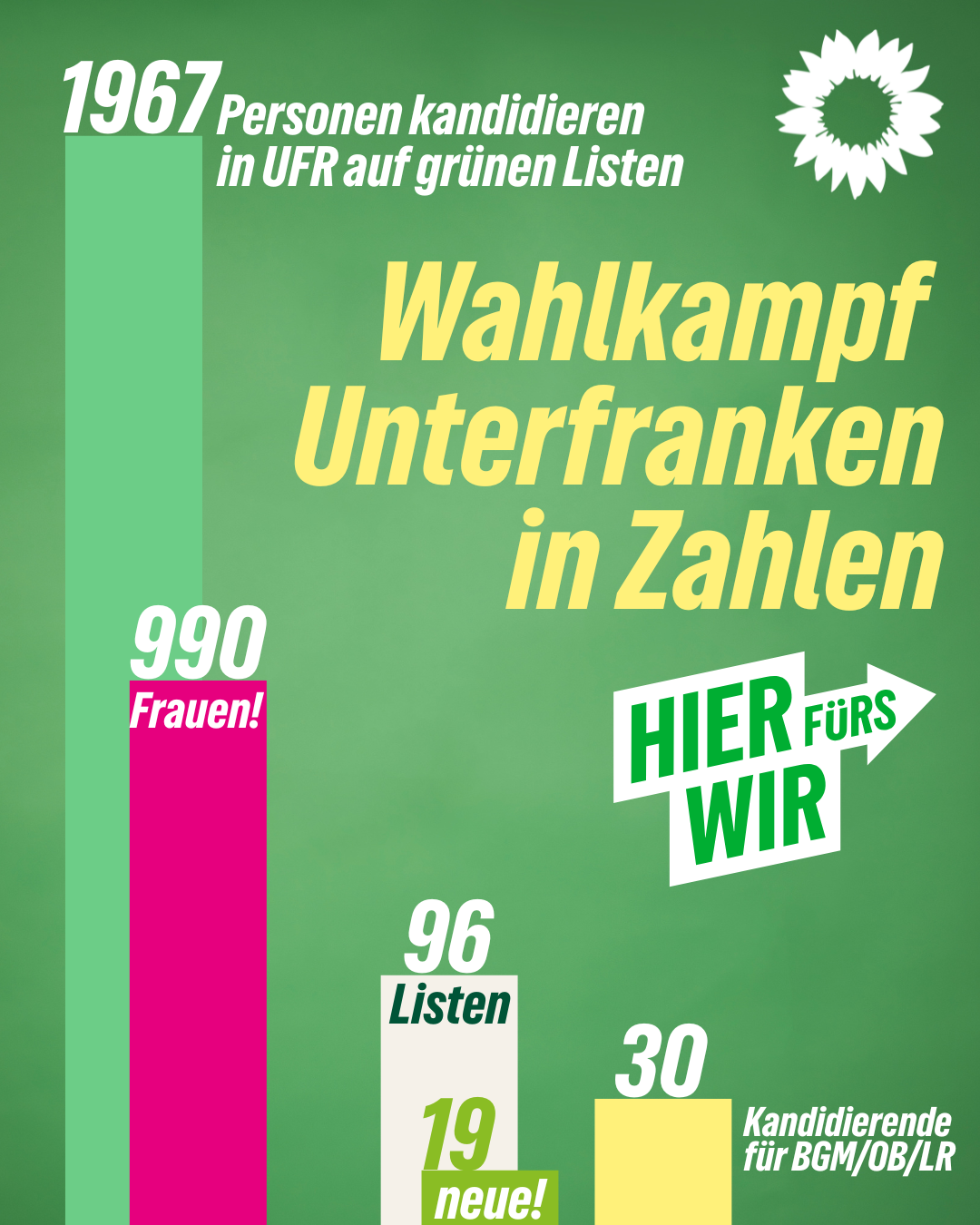 1967 Personen kandidieren auf 96 Listen. Die Hälfte sind Frauen! Jede 5. Liste ist neu dazugekommen. Außerdem freuen wir uns über 3 Oberbürgermeisterkandidierende, 5 Landratskandidat*innen und 25 Bürgermeisterkandidierende. Was für ein starkes Angebot für unsere unterfränkischen Kommunen! Dort vor Ort wird Politik gemacht und ihr wählt am 8. März am besten GRÜNE für ein zukunftsfähiges Unterfranken!